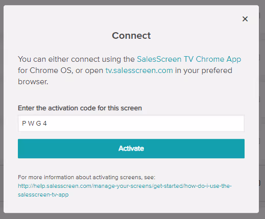 With the code in hand, you can navigate to https://app.salesscreen.com/#/screens/overview, and locate the screen you want to connect to. Click “Connect”, and enter the code that appears on the screen.