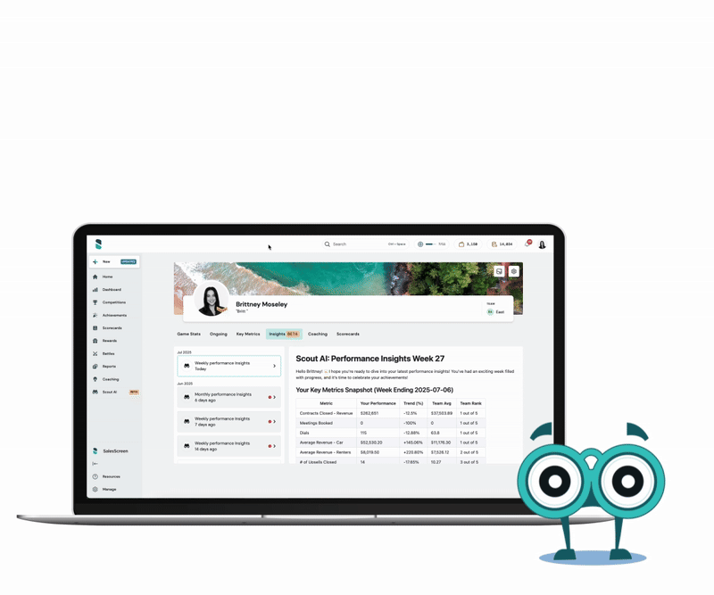 Introduce Scout, our intelligent accountability engine, giving teams instant, actionable visibility into performance. Scout delivers real-time performance updates and nudges reps toward targets, fostering ownership and clarity. With Scout, managers can trust the pulse of every rep and act quickly to keep everyone aligned. The result? An environment where every individual knows their goals and how to reach them, without delay.